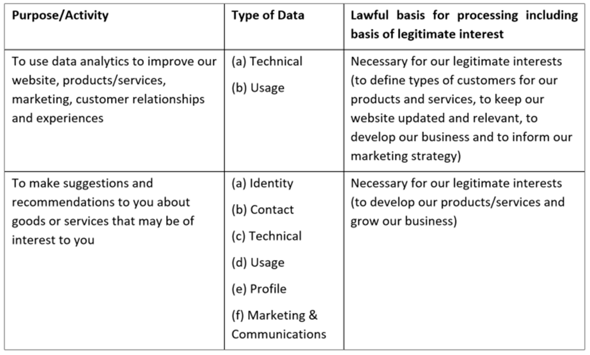We have set out below, in a table format, a description of all the ways we plan to use your personal data, and which of the legal bases we rely on to do so. We have also identified what our legitimate interests are where appropriate. Note that we may process your personal data for more than one lawful ground depending on the specific purpose for which we are using your data.